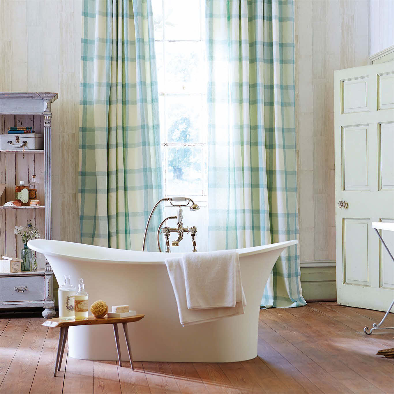 Un tissu en voile de lin intemporel avec un motif à carreaux discret et ouvert, produit dans des coloris apaisants