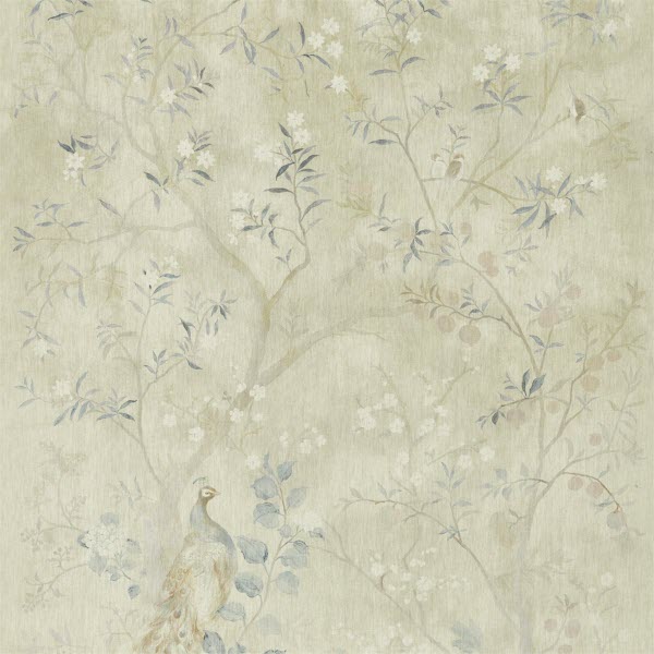 Basé sur un délicat panneau chinoiserie représentant des paons perchés sur des branches de fleurs, ce panneau 100% lin a été repeint et imprimé numériquement dans des coloris doux.