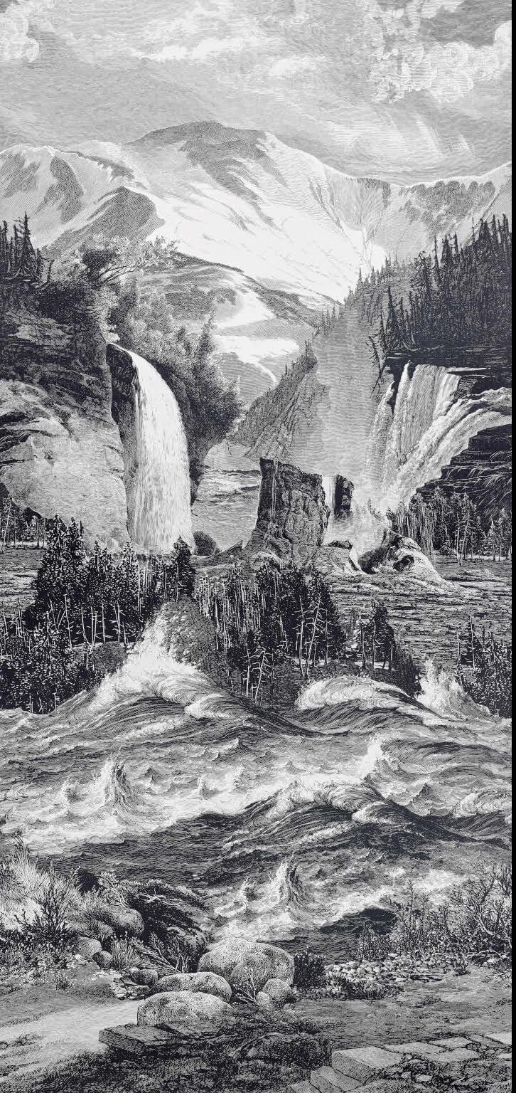 Fantasmagorique où les éléments naturels se déchaînent. Le traitement et l’ambiance qui se dégage de cet imprimé sur lin ne sont pas sans rappeler les gravures du nord de l’Europe du XVIIe siècle.