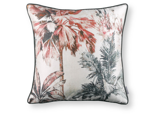 Ce coussin coloré comprend un dessin de feuillage luxuriant et des palmiers exotiques avec un velours uni doux sur l’envers donnant une élégance exquise.